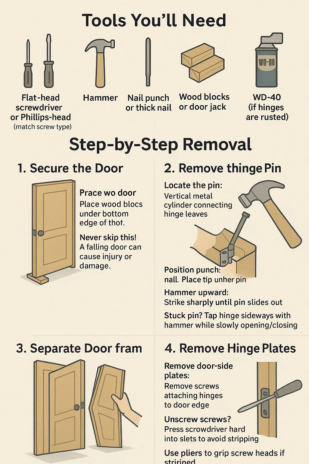 Távolítsa el a csavarokat rögzítő zsanérokat az ajtókerethez.