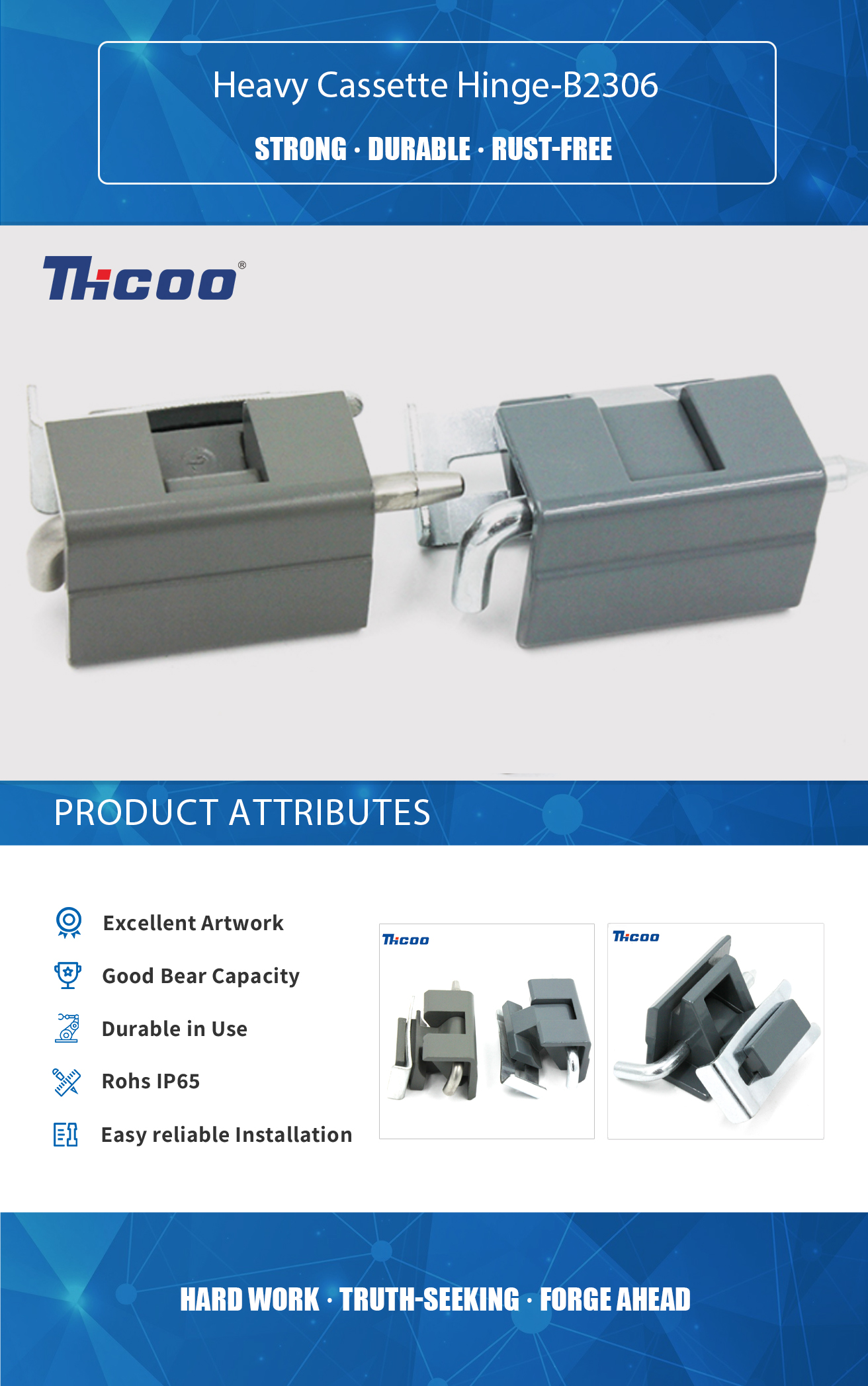 Saját vizsgálólaborral, valamint fejlett és teljes ellenőrző berendezéssel rendelkezünk, amelyek biztosítják a termékek minőségét. A B2306 nehéz kazettás csuklópántot nehéz panelek vagy ajtók megtámasztására tervezték. Ezek a zsanérok gyakran különféle kivitelben kaphatók, például króm vagy fekete színben, ami lehetővé teszi, hogy beleolvadjanak a környező dekorációba.