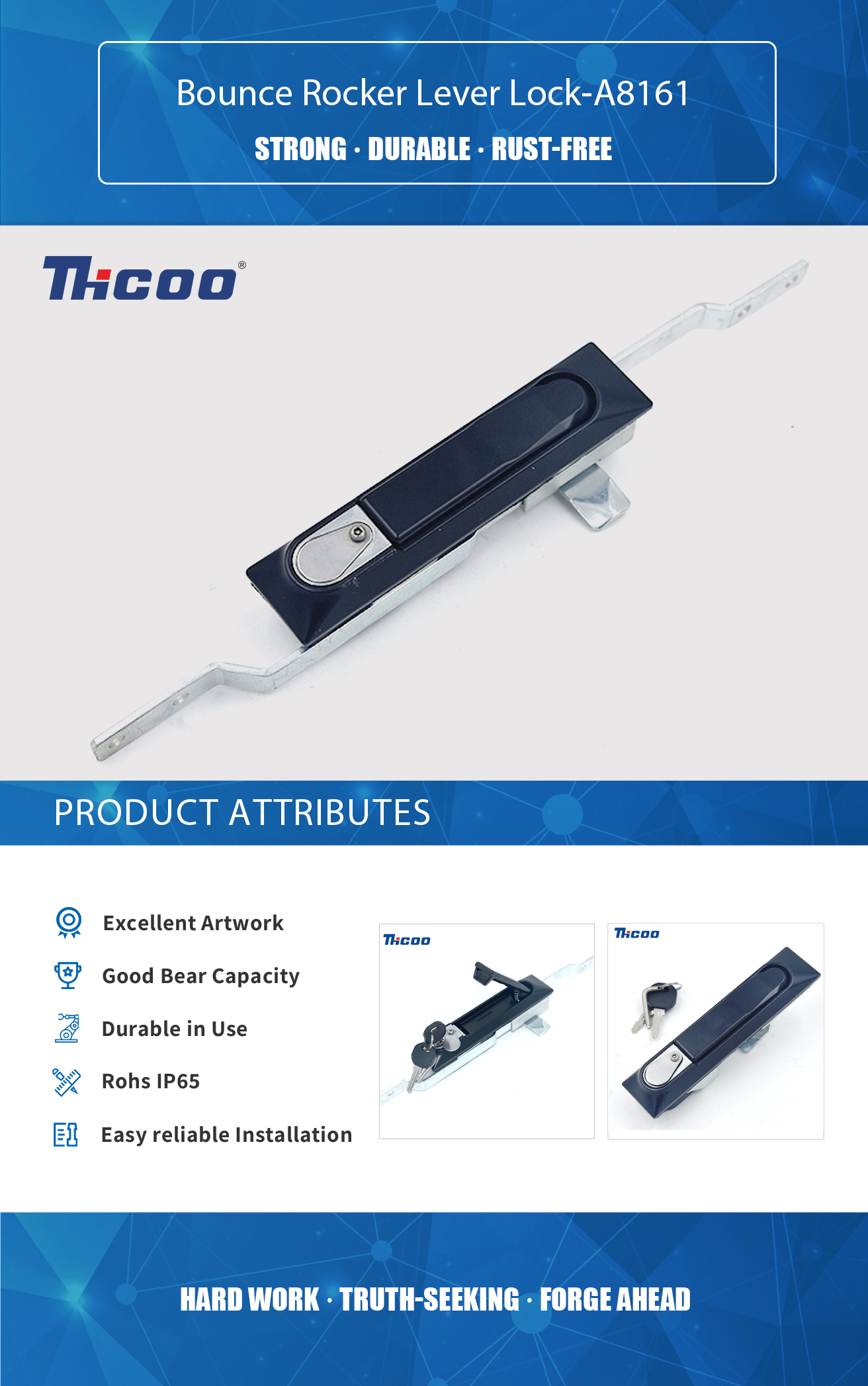 Saját vizsgálólaborral, valamint fejlett és teljes ellenőrző berendezéssel rendelkezünk, amelyek biztosítják a termékek minőségét. A Bounce Rocker Lever Lock-A8161 egy olyan típusú zár, amely billenőkaros mechanizmust és rugós reteszt használ az ajtó rögzítésére. vagy más eszközzel. A billenőkart egy kulccsal vagy más szerszámmal mozgatja a mechanizmus kinyitása és az ajtó kinyitása. A rugós retesz visszapattan a helyére, amikor az ajtót becsukják, segítve az ajtó biztonságos zárását.
